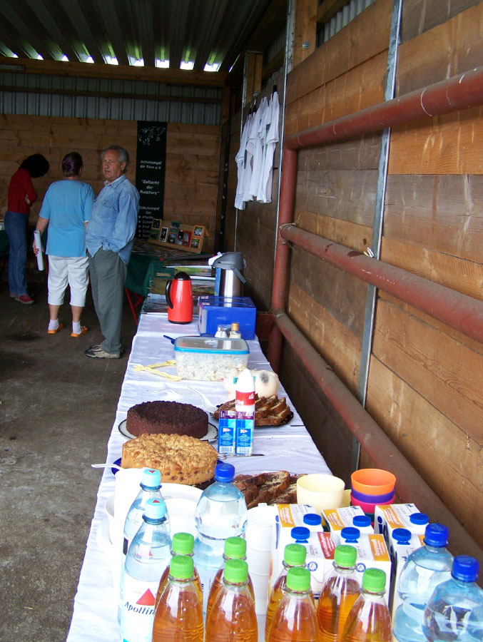 Am 10. August fand das nächste Patentreffen statt – diesmal in der niedersächsischen Pflegestelle Rehden bei unseren Rindern, Schweinen und Gänsen. Jeder war schon am frühen Morgen auf seine Weise damit beschäftigt, sich für das Patentreffen vorzubereiten, der eine mit ausgiebiger Körperpflege, um besonders schön auszusehen, andere schliefen lieber aus, um später topfit zu sein. Fleißige Zweibeiner bauten inzwischen Infostand und Büffet auf.