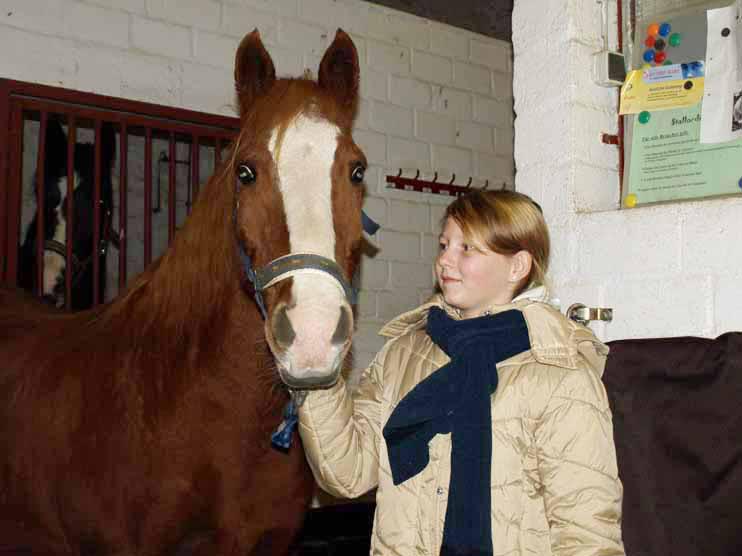 Die meisten unserer Pferde haben leider keine besonders gute Erfahrungen mit Kindern gemacht, deshalb kümmern sich vorwiegend erwachsene Frauen um die Pflege unserer Pferde. Andererseits finden wir es sehr wichtig, dass gerade Kinder schon lernen, dass auch Pferde, die alt geworden sind, einen schönen Lebensabend verdient haben und nicht einfach zum Schlachter gebracht werden dürfen. Unsere Patin Nicki brachte also Alexandra mit, ein 12 Jahre altes pferdebegeistertes Mädchen. Sie kennt sich schon gut aus - hat bereits die Prüfung zum "kleinen Hufeisen" bestanden.