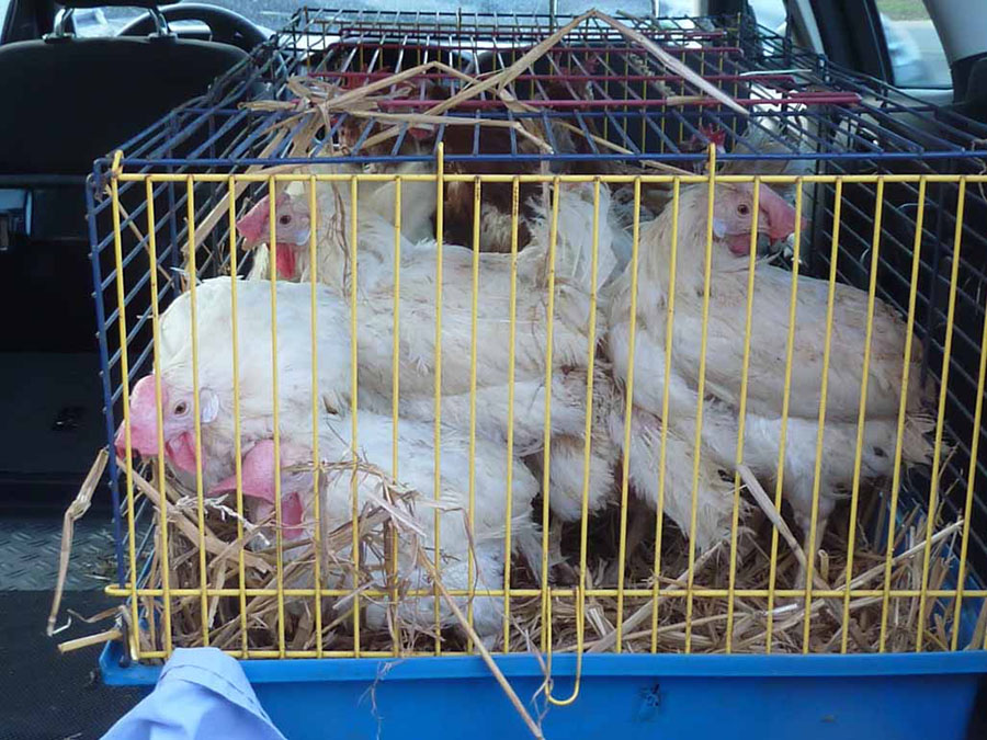 Legehennen werden im Alter von nur 15 Monaten "ausgestallt", weil dann ihre Legeleistung bereits nachlässt. Die Legehennenbetriebe lassen die Tiere normalerweise durch Dienstleister in Boxen packen, die im Akkord arbeiten, gebrochene Beine und Flügel sind dabei an der Tagesordnung.