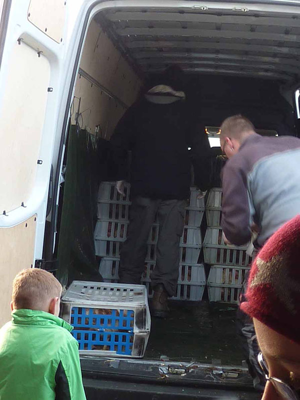 Anschließend werden die Hennen in Kunststoffboxen auf große LKW gepackt (4000 Hühner sind in der Regel auf einem LKW) und nach Belgien und in die Niederlande zu großen Schlachthöfen gefahren, wo sie am Fließband umgebracht werden.
