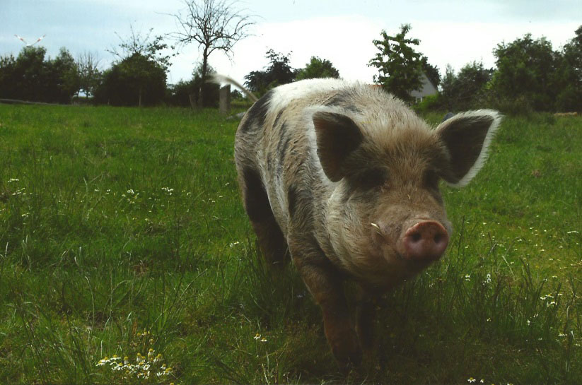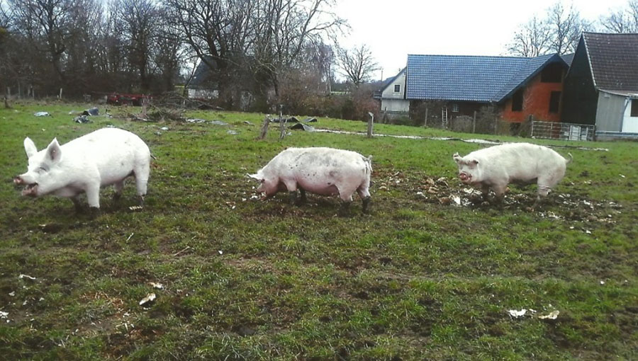 Und sie kam im Frühjahr 2006 auch schon mit nur einer Ohrmuschel zur Welt. Susi und ihre Brüder Stromer und Strolch ging ja aus dem Techtelmechtel ihrer Mutter Hannah mit einem Wildschweinkeiler hervor. Nachdem der Keiler in das Schweinegehege eingedrungen war, hatten wir vorsorglich alle Sauen mit Wehenförder spritzen lassen. Nicht schön, aber die Vorstellung, dass der Keiler womöglich alle neun Sauen beglückt haben konnte, ließ uns in eine gewisse Panik verfallen und damals zu diesem Mittel greifen. Denn sonst wären womöglich 90 Ferkel zur Welt gekommen. Außerdem leiteten wir den Umzug unserer Schweinerotte in die Wege, um einen erneuten Wildschweinbesuch für die Zukunft auszuschließen.