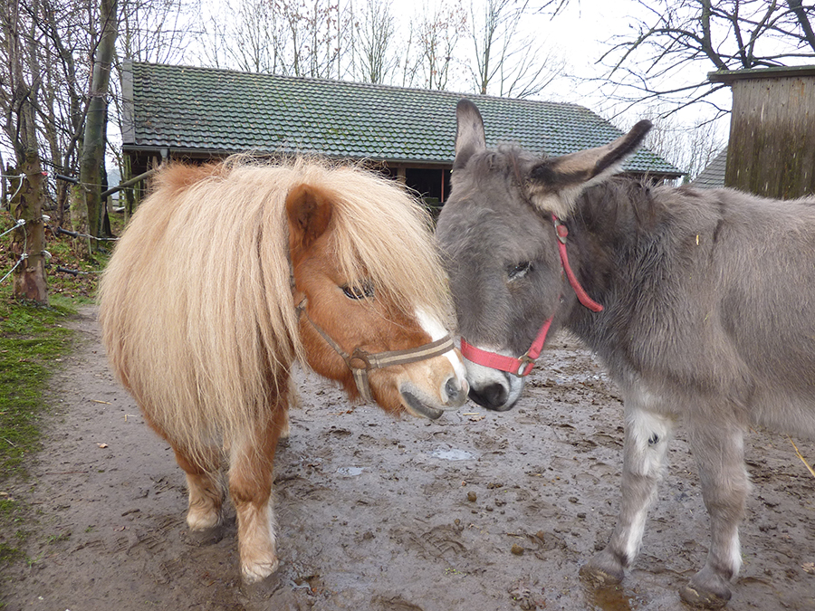 Um ihn auf andere Gedanken zu bringen, wurde dann versucht, Rudi in die Ponyherde zu integrieren. Und das klappte auf Anhieb. Darüber waren alle sehr glücklich, denn bevor Charly nach Geldern kam, stand Rudi allein, weil er sich zuvor als ehemaliger Hengst auf der Ponywiese ziemlich daneben benommen hatte. Scheinbar hatte die Gesellschaft von Charly ausgleichend auf Rudi gewirkt. Esel haben einen tollen Charakter und sind die Ruhe selbst. Es war vielleicht auch Charlys Lebensaufgabe, Rudi so zu einem Platz in der Herde zu verhelfen.