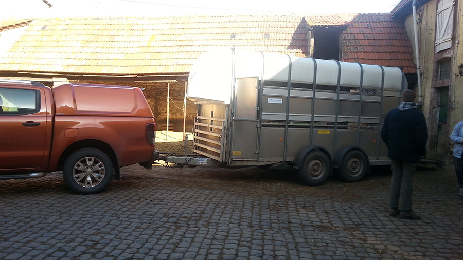 Im Vergleich zu Sams war der Umgang mit dem geretteten Zwillingskalb Stella, die am 8. April vom Hof gegenüber unseres Vereinsbüros in die Pflegestelle Rehden in Niedersachsen umziehen sollte, recht einfach. Junge Kälber sind zwar oft sehr verunsichert, was ohne Mama ja auch kein Wunder ist, aber man kann sie relativ einfach auf den Anhänger schieben.