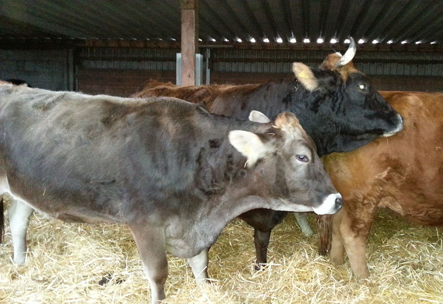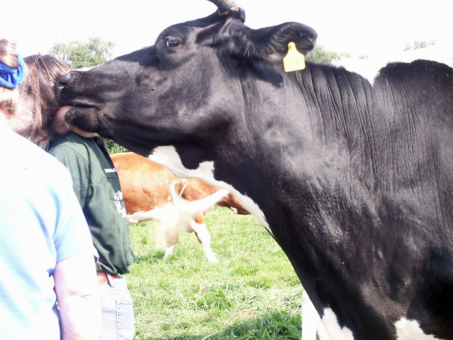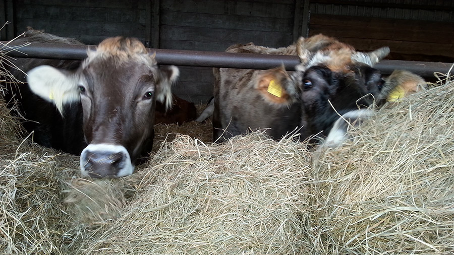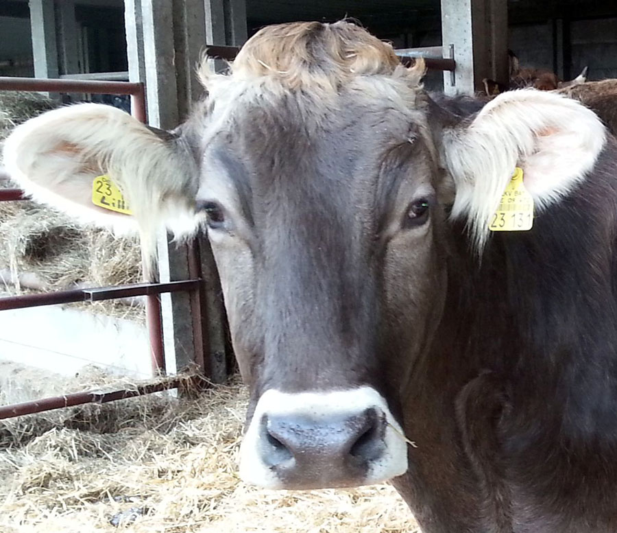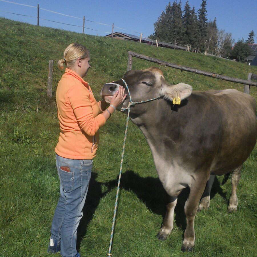 Lilly hatte ein Kalb bekommen und war so zur „Milchkuh“ geworden. Auch auf den Bio-Höfen werden die Kälber aber von den Müttern getrennt, in der Regel einen Tag nach der Geburt. Die Kälber erhalten Milchaustauscher, die Milch wandert in die Molkerei für die Ernährung der Menschen, denen sie meistens gar nicht so gut bekommt, wie man heute zum Glück weiß. Heutzutage sind Kühe „Hochleistungstiere“, sie geben die gigantische Menge von 10.000 Liter Milch pro Jahr. „Allgäuer Braunvieh“ kommt an diese ganz hohen Werte (zu Lillys Glück) nicht heran, bei dieser Rasse sind es „nur“ 6.000 Liter pro Jahr. Trotzdem sind auch bei diesen Kühen durch das hocheiweißreiche Futter Klauenprobleme und Erkrankungen am Skelett und am oft gigantisch großen Euter an der Tagesordnung. Lilly zeigte Lahmheiten und deshalb ließ der Bauer sie nicht mit hinaus, weil sie nicht gut laufen konnte. So stand sie den ganzen letzten Winter in Anbindehaltung und das auch noch auf Gitterrosten. Wenn der Bauer dann mit dem Melkzeug kam, wurde sie hochnervös und schlug aus. Das war ihr Todesurteil – sie sollte zum Schlachter, da sie für den Bauern wertlos geworden war. Eine Milchkuh, die sich nicht melken lässt, hat keine Daseinsberechtigung mehr. Robert, ein Tierschützer in der Nähe, kannte den Bauern und kaufte Lilly frei.