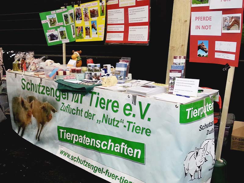 Zur Ablenkung war es ganz gut, dass kurz danach, vom 13. bis 15. November, die Pferdesportmesse in Kalkar am Niederrhein stattfand, wo wir – ohne Standmiete- mit einem Infostand teilnehmen durften. Vielen Dank dafür an den Veranstalter, die WRW oHG. Dadurch, dass wir direkt am Show-Ring standen, konnten wir erfreut feststellen, dass bis auf zwei Vorführungen die Pferde alle gebisslos geritten wurden. Und es gab viele Vorträge von Osteopathen, Tierärzten, Sattlern und Spezialisten in der Ausbildung von Pferden, bei denen der Tierschutz eine wesentliche Rolle spielte. Nicht alle Besucher der Messe ließen sich auf ein Gespräch mit uns ein, auch weil sie natürlich wegen der Vorführungen zum Showring kamen, aber wir bekamen doch einiges positives Feedback und konnten viele Gedankenanstöße geben.