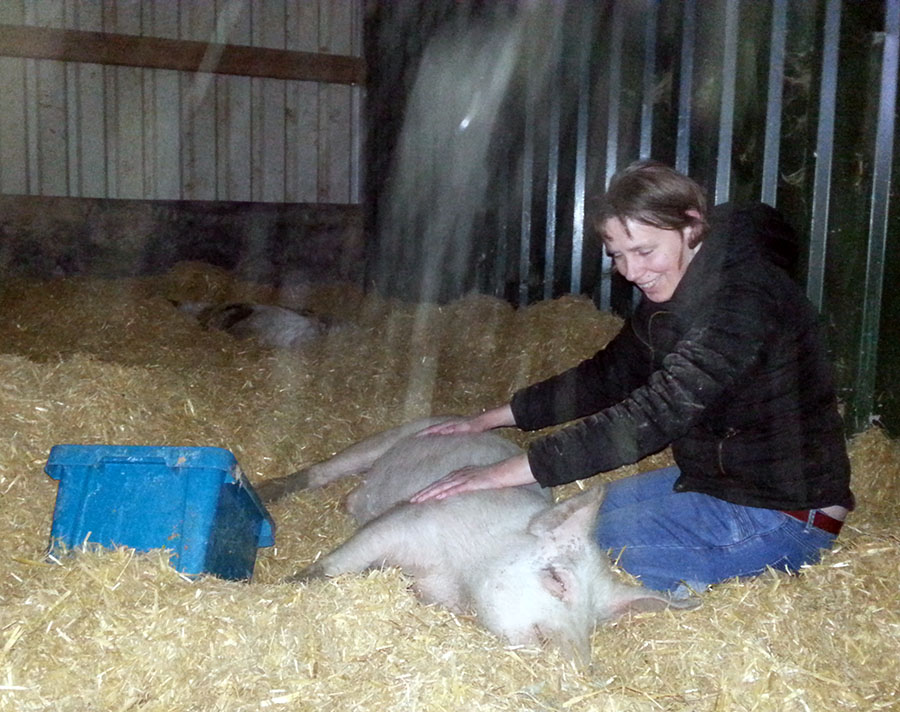Nachdem beide Schweine dann glücklich in Schwefe wieder vereint waren, schalteten wir unsere Cranio-Sacral-Therapeutin Carmen wieder ein, die Schweini behandelte, was diesem sichtlich gut gefiel.