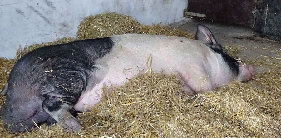 Auf der Fahrt nach Rehden randalierte er dann allerdings ziemlich auf dem Transporter, er konnte ja nicht wissen, dass er ins Schweineparadies gebracht wurde. Dementsprechend lag er nach dem Ausladen sehr müde auf seinem Strohbett.