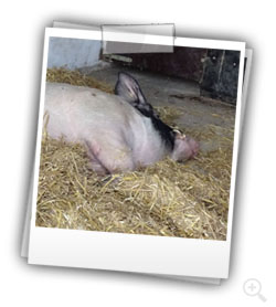 Petra Wintersohl bekam am absoluten letzten Tag der Frist, die der Amtsveterinär mit viel gutem Willen aber vermutlich auch entnervt noch eingeräumt hatte, ein Foto von Schweini, der gar nicht daran dachte, sein Paradies zu verlassen. Vielmehr hatte er es sich mit seinen 350kg Körpergewicht auf der Ladeklappe des Anhängers gemütlich gemacht, die einladend mit Stroh bedeckt war.