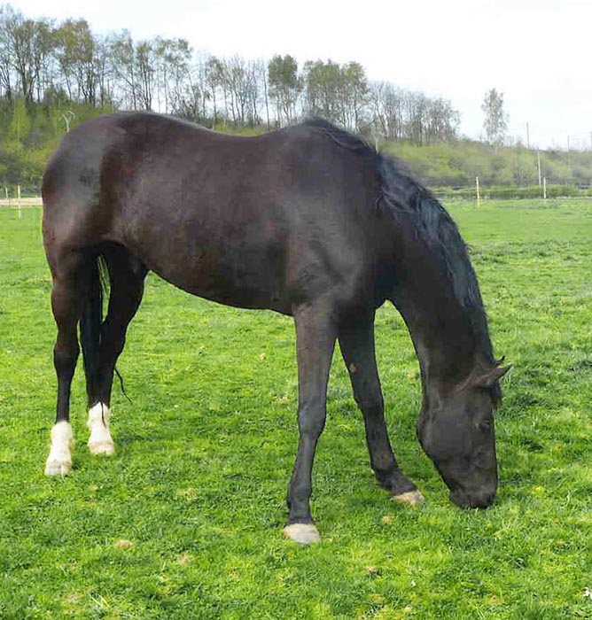 Der wunderschöne 2008 geborene Rappe wurde viel zu jung und offenbar brutal angeritten. Dadurch erlitt er einen schweren Fesselträgerschaden, so dass er kaum noch laufen konnte. Nach monatelanger Boxenruhe stand schließlich fest, dass er vermutlich nicht einmal mehr freizeitmäßig geritten werden konnte. Und deshalb wollte sein Besitzer ihn schlachten lassen.