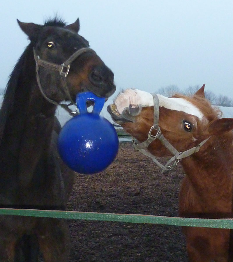 Douby hatte bei uns auf dem Pferdeschutzhof dann 11 Jahre ein tolles Rentnerleben, spielte mit seinem Freund Silver viele Jahre auf dem Paddock hingebungsvoll mit dem Ball.
