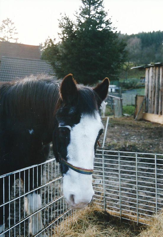 Die Criollo-Stute wurde im Januar 1982 geboren und landete im Frühjahr 2003 auf dem Pferdemarkt in Hamm, wo sie von uns zum Schlachtpreis freigekauft wurde. Lady war arg abgemagert, hatte eine bereits geschädigte Hüfte und schlechte Leberwerte. Wir päppelten sie mit Leberkur und riesigen Mengen Senior-Kraftfutter auf und sie erholte sich, hatte einen schönen Sommer.