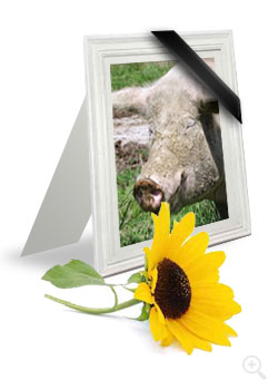 Der im Juli 2012 geborene Happy sowie seine Gefährten Attila und Filou hatten Glück. Sie wurden aus einer Schweinemastanlage gerettet. Die Tierschützer hatten aber leider nicht die Möglichkeit, die drei Freunde ein natürliches Schweineleben lang artgerecht unterzubringen. Bevor sie im Juni 2013 in unsere Pflegestelle Schwefe bei Soest umziehen durften, waren sie in einer Pferdebox untergebracht. In Schwefe genossen sie dann Freilauf auf 7000 qm und mussten den Metzger nicht mehr fürchten. Schweine gehen allerdings nicht immer nett miteinander um, Neuankömmlinge werden gerne gemobbt und auch gebissen. Deshalb ist Happy grün vom Desinfektionsmittel. Mittlerweile leidet er auch unter einer Gehbehinderung, sein rechtes Hinterbein ist am Fesselgelenk geschwollen. Aber er genießt trotzdem noch sichtlich sein Leben.