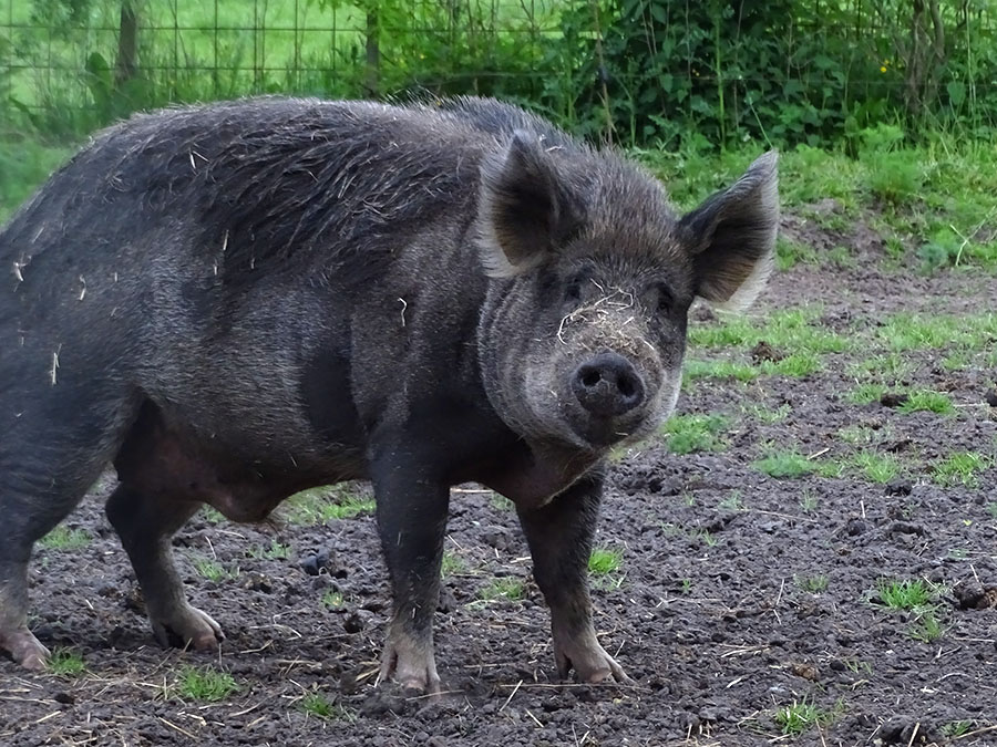 Strolch konnte seinen Vater nicht verleugnen, er war ein waschechter Keiler. Er drang im Dezember 2005 in unser damaliges Schweinegehege bei Wagenfeld ein, obwohl es mit einem doppelten Zaun und Strom gesichert war. Unsere Sau Hannah hatte ein folgenschweres Techtelmechtel mit dem Keiler – das Ergebnis waren (Gott sei Dank) „nur“ drei Ferkel, die zu Ostern 2006 auf die Welt kamen. Allerliebst sahen sie aus und ihre Mutter Hannah wirkte richtig stolz. Strolchs Schwester Susi kam allerdings mit nur einer Ohrmuschel zur Welt, vielleicht hatte da der Wehenförderer gewirkt. Nach dem Besuch des Keilers hatten wir nämlich den Rat von Tierärzten eingeholt, wie man bei Schweinen die Trächtigkeit unterbrechen kann. Das war nicht schön, aber eine gesunde Sau kann locker 10 Ferkel zur Welt bringen. Das hätte uns in große Schwierigkeiten gebracht. Die Tierärzte rieten deshalb dazu, Wehenförderer zu geben. Den neun Sauen war damals zum Glück nichts anzumerken – wir wissen bis heute nicht, inwiefern der Wehenförderer gewirkt hat. Allerdings sind Susi und Stromer vergleichsweise früh gestorben, Susi wurde neun Jahre alt und Stromer starb überraschend im Februar 2018. Aber vielleicht ahnte er, was kommen würde und wollte nicht mehr umziehen. Denn im April 2018 sind unsere Schweine alle in den Hochsauerlandkreis, nach Erflinghausen bei Meschede, umgezogen.