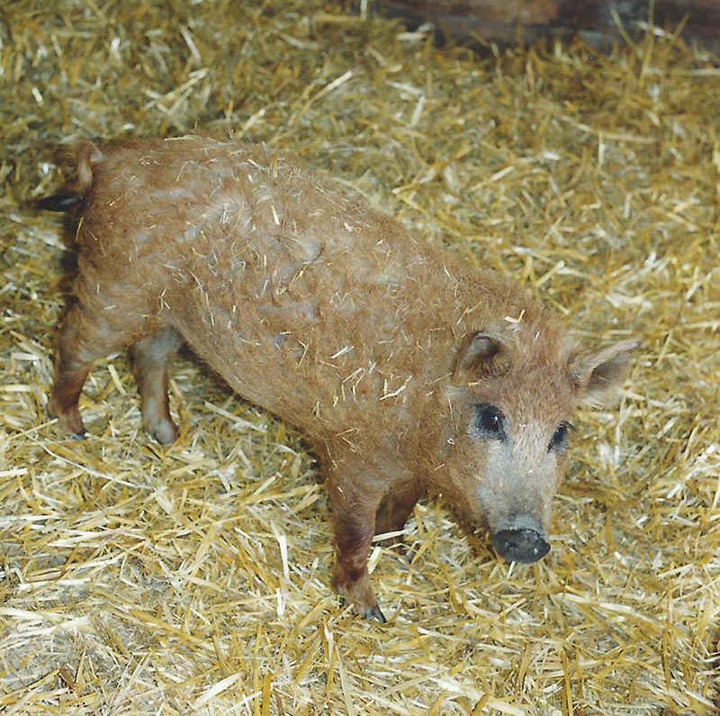 Das kleine Wollschweinmädchen Trudy kam zusammen mit ihrer Schwester Elli im Frühjahr 2004 zu uns. Die beiden stammten von einem Tierschutzhof im Westerwald, der zwei ausgewachsene Wollschweine auf der Landstraße aufgelesen hatte. Kurz darauf bekam die Sau, Waltraud, elf Ferkel.