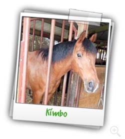 Kimbo wurde 1994 geboren und war ein Reitpferd mit immer wieder wechselnden Besitzern. Die letzten, eine Familie, hatten kein Geld mehr für seine Versorgung und verkauften ihn. Zweimal kam er wegen Lahmheit zurück und sollte schließlich als Beistellpferd abgegeben werden. Zu diesem Zeitpunkt war er schon völlig verstört und im Umgang äußerst schwierig. Im November 2006 hatte Kimbo das große Glück, bei Schutzengel für Tiere aufgenommen zu werden, anstatt beim Pferdehändler zu landen. In der Pflegestelle Geldern hat er gelernt, wieder Vertrauen zu fassen und es wurde dort auch behutsam mit ihm gearbeitet. Denn junge Pferde brauchen Beschäftigung, sonst werden sie auf die Dauer ungenießbar, genau wie Zweibeiner, die keine Aufgabe mehr im Leben haben.