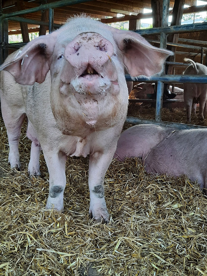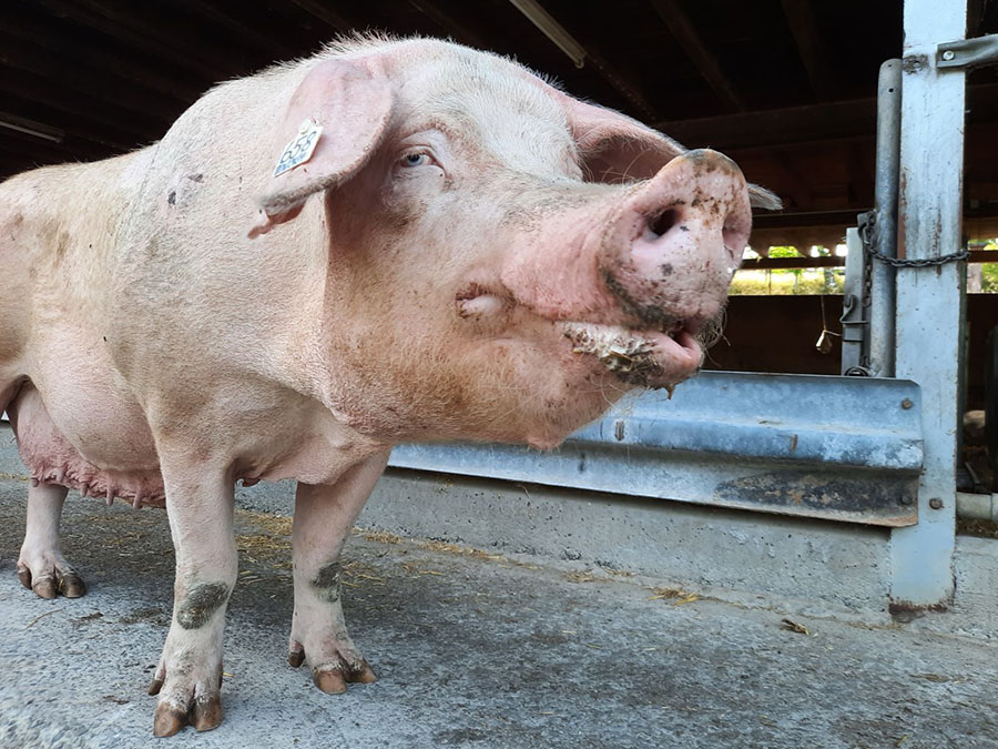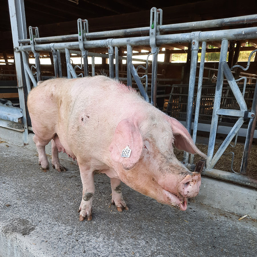 Die schon ältere Schweinemutter wurde bereits im Alter von sechs Monaten zum ersten Mal besamt, dann für drei Tage im Kastenstand eingesperrt, um die Trächtigkeit sicherzustellen.
