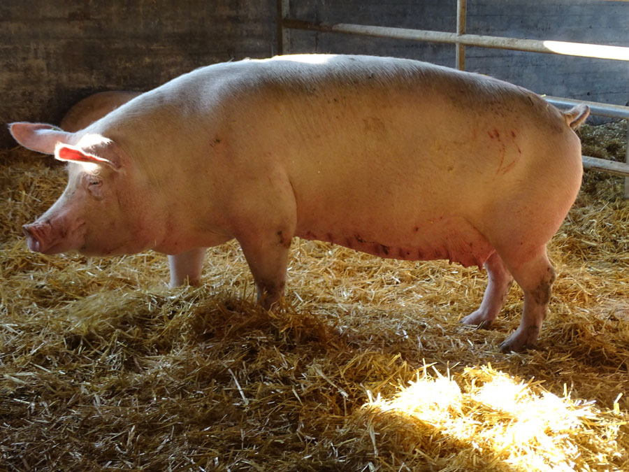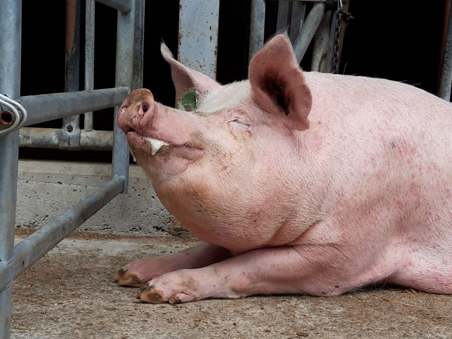 Aber Joy hatte Glück. Sie darf in unserer Pflegestelle Erflinghausen einen Lebensabend auf Stroh in einem lichtdurchfluteten Stall verbringen. Vom Stall aus kann sie den Himmel sehen und im Auslauf die Sonne auf ihrer Haut spüren. Es ist schwierig, Muttersauen vor der Schlachtung freizukaufen, da die Betriebe abgeschottet sind. Joy und ihre sieben Gefährtinnen verdanken ihre Rettung einer unglaublich engagierten und resilienten Veganerin, die das Vertrauen des Betreibers von einem Sauenbetrieb hat. Sie ist regelmäßig im Betrieb und darf Lebensplätze für „ausgediente“ Sauen und nicht für die Mast taugliche Ferkel suchen. Erfreulicherweise muss sie für eine Sau auch weniger als den Schlachtpreis bezahlen und für die Ferkel gar nichts.