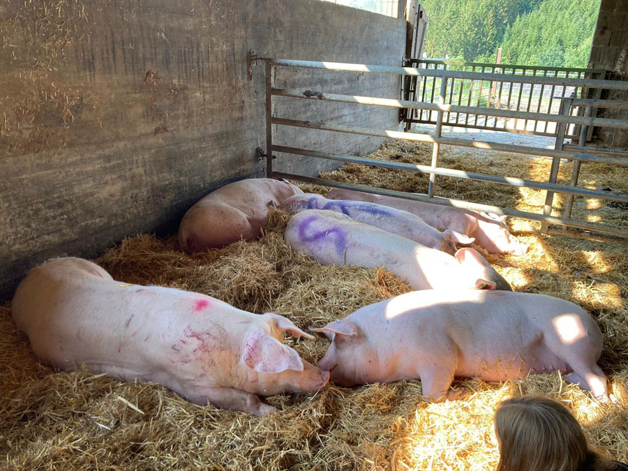 Sie kam bis zur Abholung mit Sauen aus anderen Gruppen zusammen in eine große Bucht, wo sie auch noch einen Rangkampf durchmachen musste. Der Schweinebauer hätte für ihren geschundenen Körper 250 € vom Händler bekommen. Sie wäre mit furchtbaren Milchstauschmerzen, Bissverletzungen und der Sorge, was wohl aus ihren Kindern geworden ist, nach einem rund achtstündigen Transport in der CO2-Betäubungskammer bei Tönnies in Rheda-Wiedenbrück gelandet, wo sie noch zwei Minuten lang Panikattacken und Erstickungsanfälle hätte erdulden müssen, bevor Bewusstlosigkeit ihrem jahrelangen Martyrium endlich ein Ende gesetzt hätte.