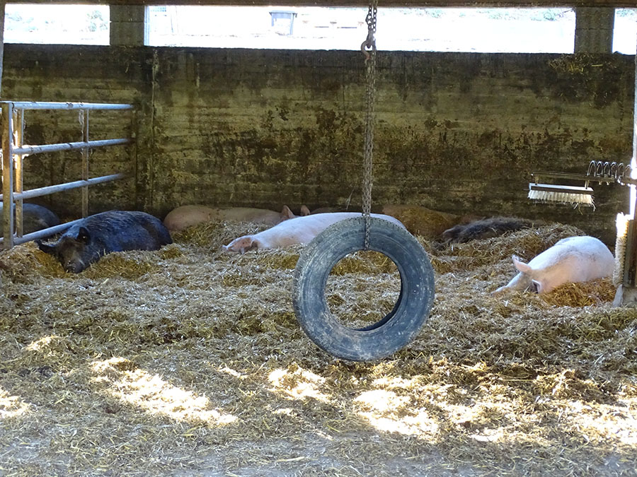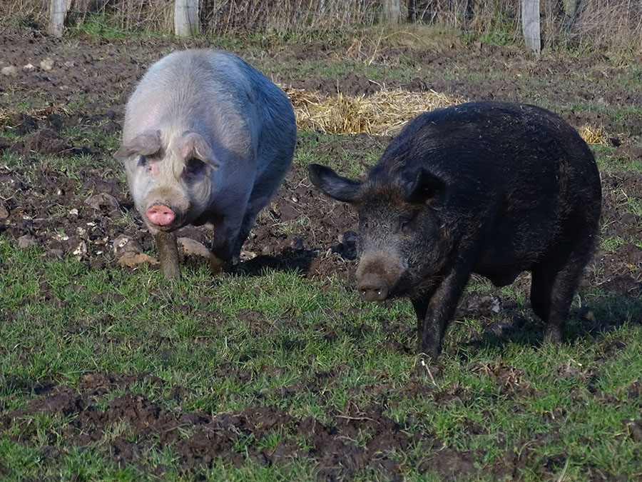 Die Schweine sind im Stall mit denselben Gefährten zusammen wie auf der Weide in Schwefe.