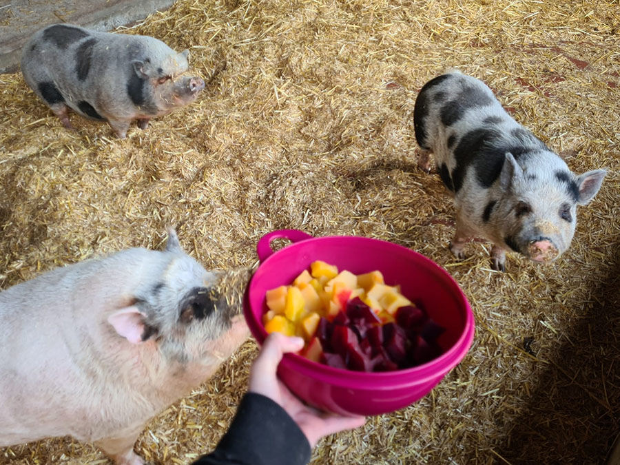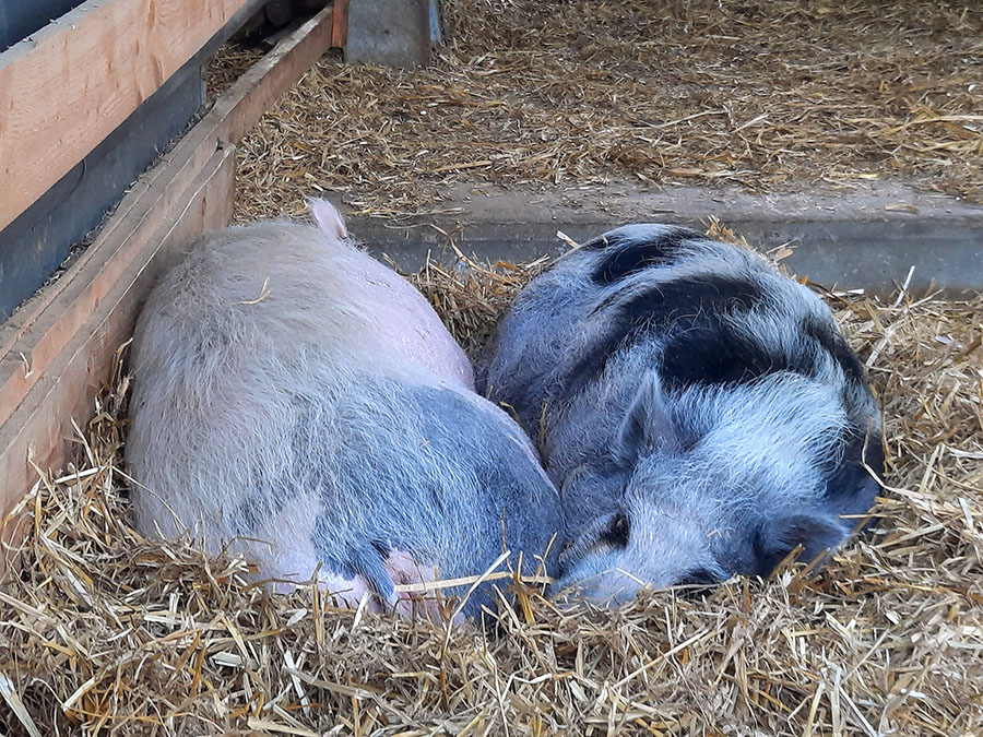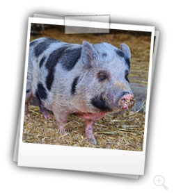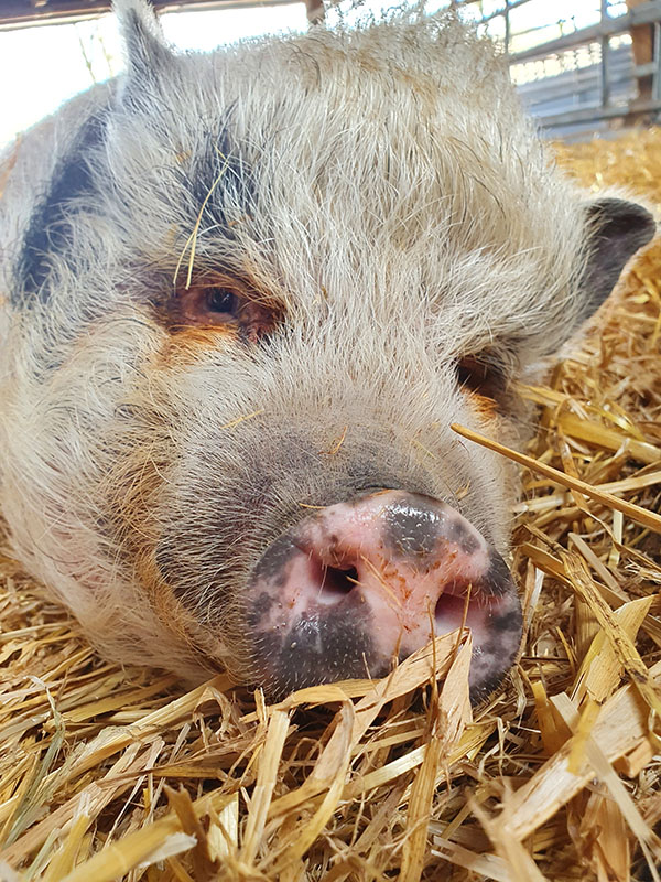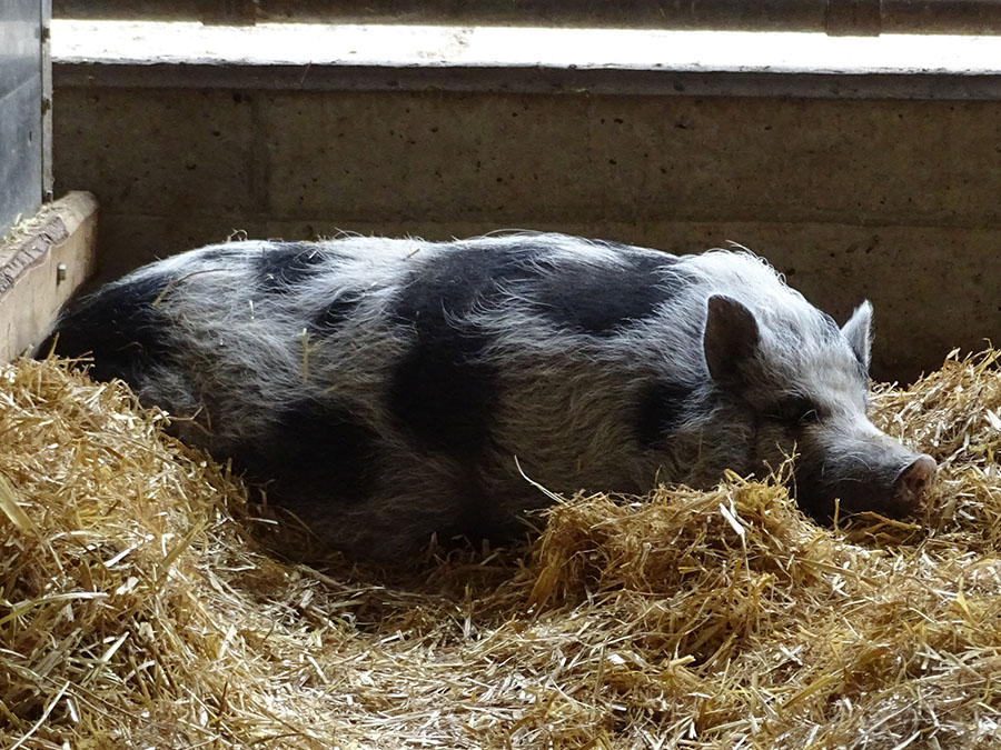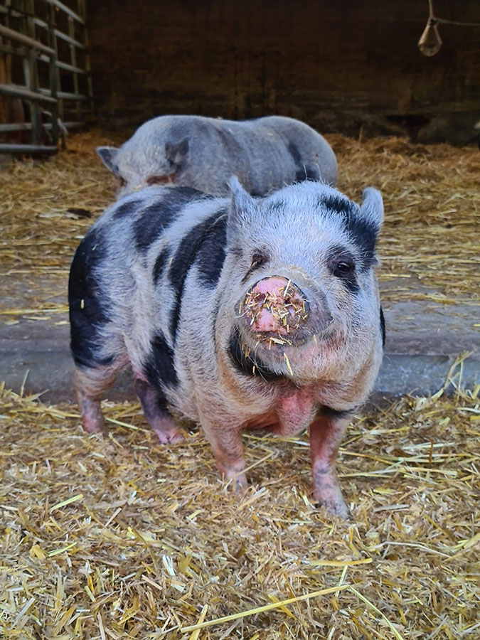 Die handzahme Schweinedame hatte zusammen mit ihrer Gefährtin Chilli ein tolles Zuhause bei Hemer im Sauerland. Die beiden konnten den ganzen Tag im Gelände herumstromern, kamen abends von selbst wieder nach Hause, weil es dort leckeren Getreideschrot zu fressen gab.