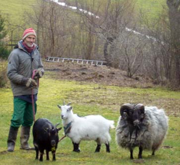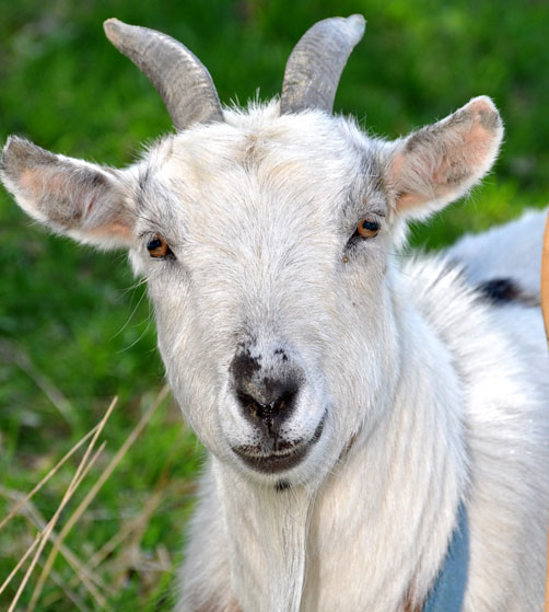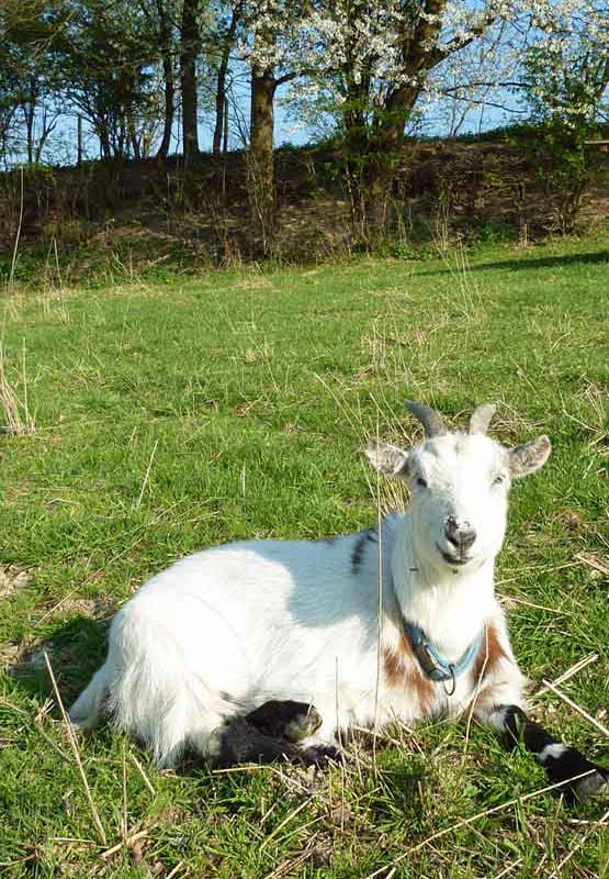 Sie wurde zusammen mit der schwarzen Ziege Hanni und dem Heidschnuckenbock Wolle aus dem Münsterland von einer mit der Tierhaltung überforderten Frau übernommen. Es gab auf dem Hof keine ziegensicheren Zäune und so gingen die Tiere spazieren, wie sie wollten. Ärger und blanke Nerven waren damit vorprogrammiert. Nanni kann 1,40 m hoch springen, wie wir feststellen mussten. Deshalb wurde der Zaun kurzerhand noch um 30 cm erhöht. Bis diese Maßnahme umgesetzt war, mussten Nanni und Hanni im Stall bleiben. Wolle, der später bei den Schafen leben soll, leistete den beiden noch Gesellschaft. Denn er war frisch kastriert und damit theoretisch noch sechs Wochen lang deckfähig. Erst danach durfte er zu seinen wolligen Artgenossen. Bis dahin war die WG Hanni, Nanni und Wolle die ideale Lösung, denn Ziege und Schaf können miteinander keinen Nachwuchs zeugen.
